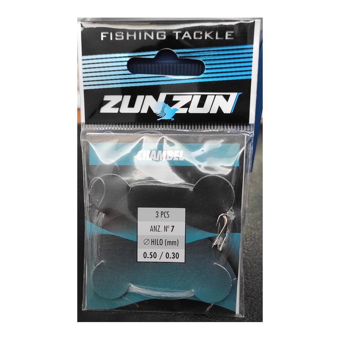 Bajo de pesca o chambel Zun Zun montado con 3 anzuelos súper afiliados. Bajo destinado a la pesca desde embarcación a fondo en fondos comprendidos entre los 20 y los 100 metros.