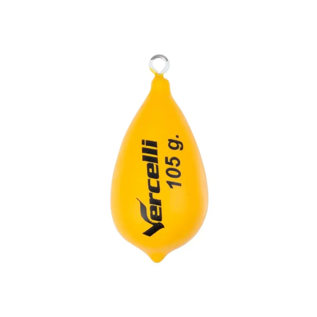 El plomo Vercelli de color amarillo ideal es para la pesca a fondo en embarcación fondeada. Se caracteriza por un hundimiento rápido y poca desviación en momentos de corriente, gracias a su forma compacta de tipo lágrima.